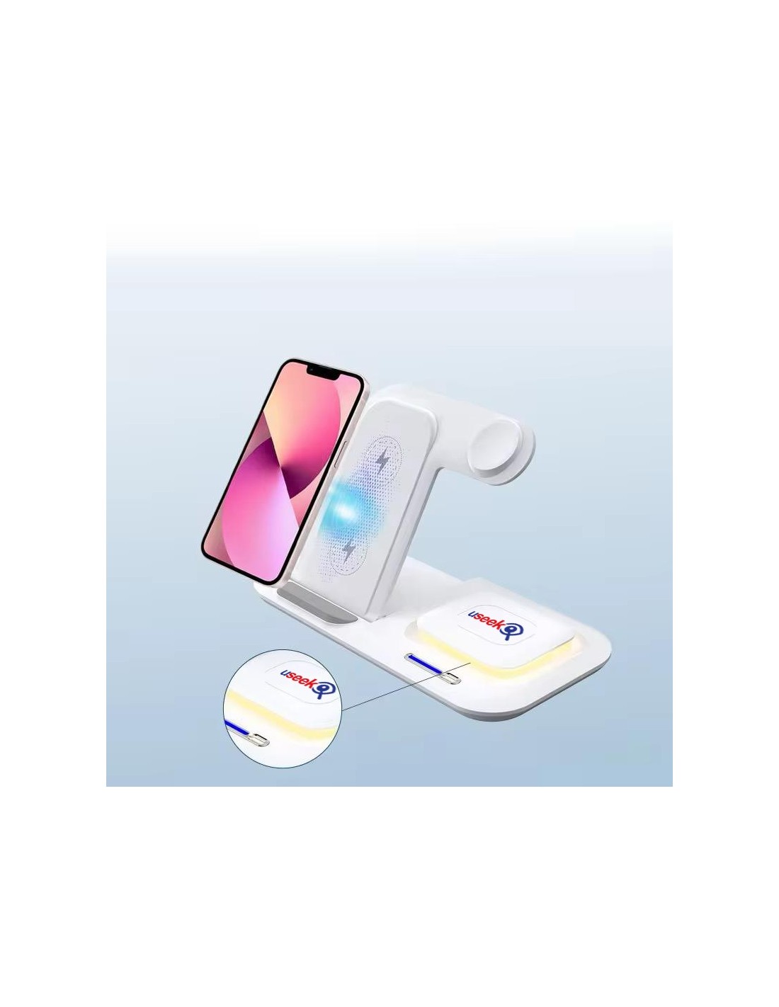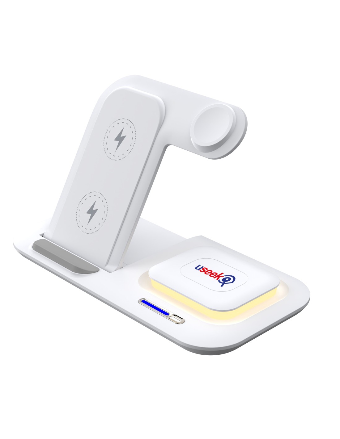 Il caricatore wireless USEEK 5 in 1 combina design moderno e funzionalità avanzate. La struttura pieghevole e salvaspazio lo rende facile da trasportare e perfetto per mantenere ordine su scrivania o comodino.